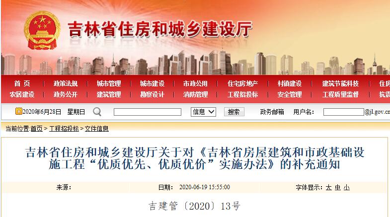行业动态|关于对《吉林省房屋建筑和市政基础设施工程“优质优先、优质优价”实施办法》的补充通知